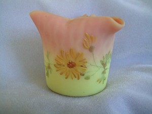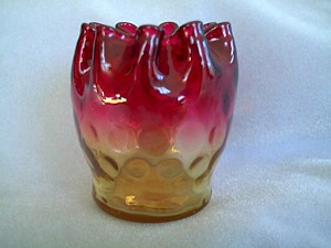 Cost is always a consideration when collecting and, of course, the actual value of the items is of equal interest. Let’s talk first about cost. As you would assume, the art glass are the rarest and most expensive category to collect. This has a direct correlation with the manufacturing process. They were not mass produced as most pressed glass items were, and the manufacturing process often required extra steps to create the desired colors and effects. Many forms of art glass involved a reheating process that altered the color of the glass. They are sometimes referred to as “heat sensitive” glass. Burmese and amberina are prime examples of this type of glass. Burmese is an opaque glass that typically has a creamy shade of yellow on the lower portion of the item that gradually changes to a delicate pink at the top. The color comes from the gold and uranium that were part of the glass formula. When the item is first created (most are blown or blown into a mold), it is a creamy yellow. Exposing the item to the high temperatures of the furnace after it has been shaped (it is inserted into the ‘glory hole’ for a short period of time), causes the pink color to emerge. The amount of pink coloration and the depth of the color are related to the degree of heat to which the item is exposed. Similarly, amberina includes gold in the batch and is initially a golden amber color. The reheating causes the top portion of the item to turn red.