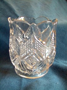 Another source of confusion for collectors is items that closely resemble toothpick holders, but are really something else such as a shot glass, match holder, or small open sugar. There are no hard and fast rules for distinguishing among these items, but there are some general guidelines that help to identify them. Shot glasses generally taper from top to bottom, have straight sides, and a plain rim; toothpicks more often have a scalloped, serrated, or shaped rim. There is often an area on match holders that can be used for striking a match. This may be a textured area on the body of the item or ridges or rings on the base. Match strikers are not found on toothpick holders. With open sugars, the shape is often the distinguishing factor. They generally have two handles and the top is the widest part of the item. Some may have a ridge that would support a lid. Remember that these are guidelines, not hard and fast rules.